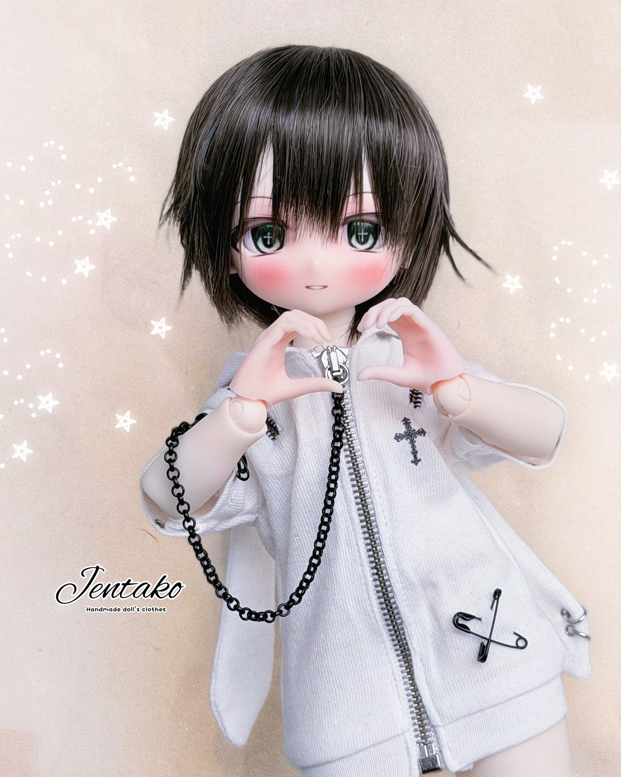肩に開閉可能なジッパー装飾とフロントからチェーンをつけてます。