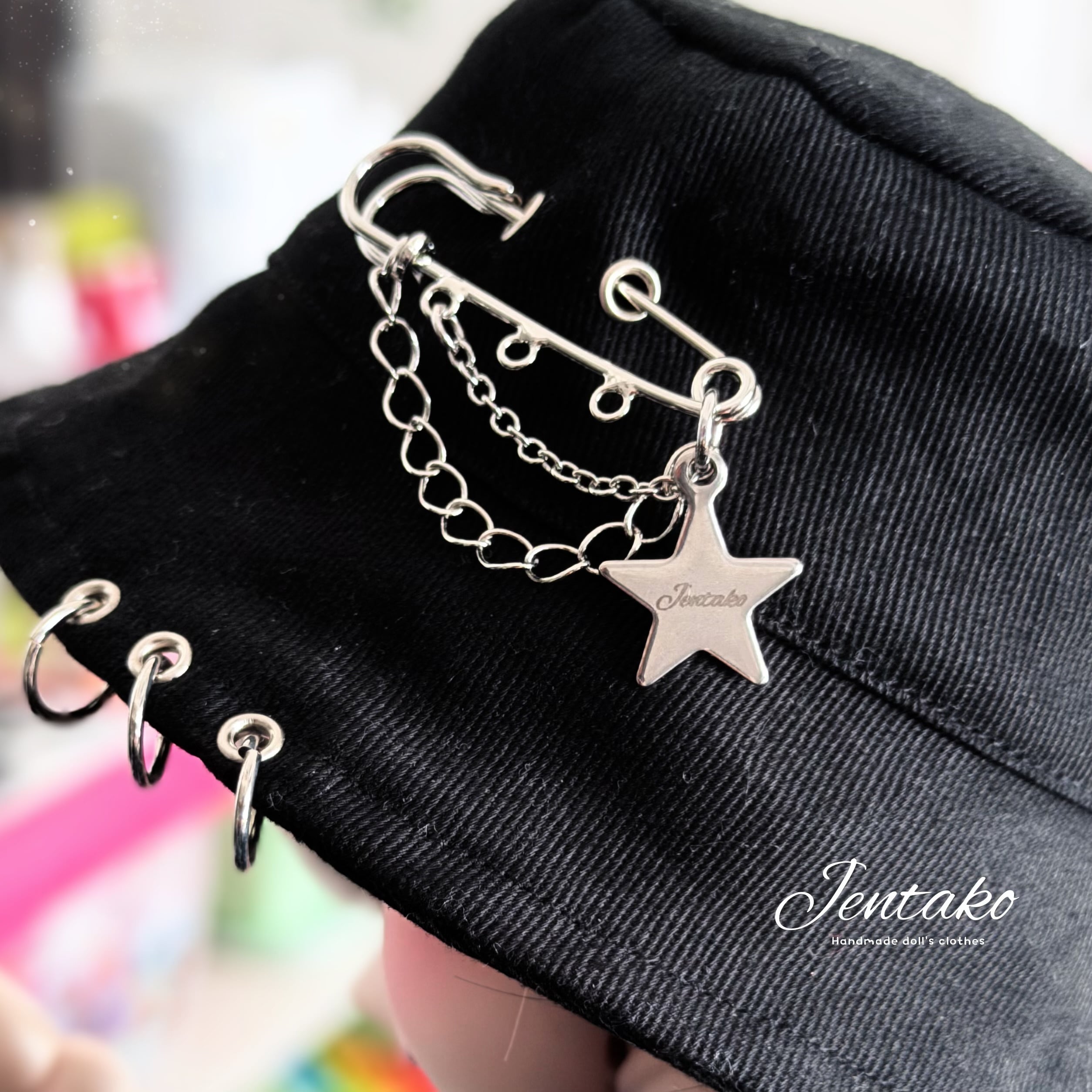 ハトメリングとチェーンピンブローチのついたサブカル感のあるバケットハット。